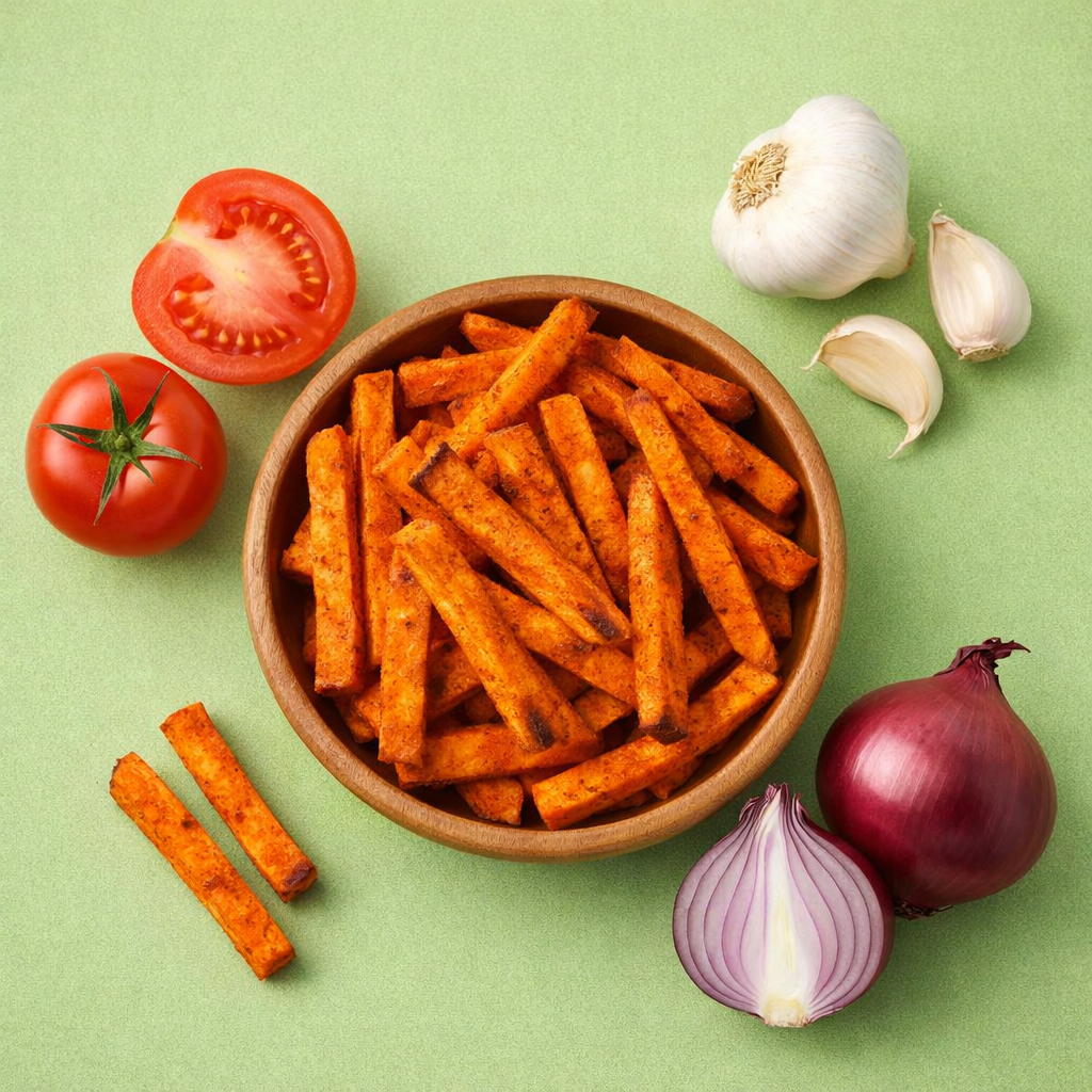 The natural sweetness of sweet potato pairs beautifully with bold tandoori spices. Gently vacuum cooked to maintain flavor and texture, each slice delivers a satisfying crunch with layers of warmth and spice that build gradually. The seasoning settles evenly into the sweet potato, creating a balanced, flavorful bite that feels comforting, bold, and easy to enjoy.