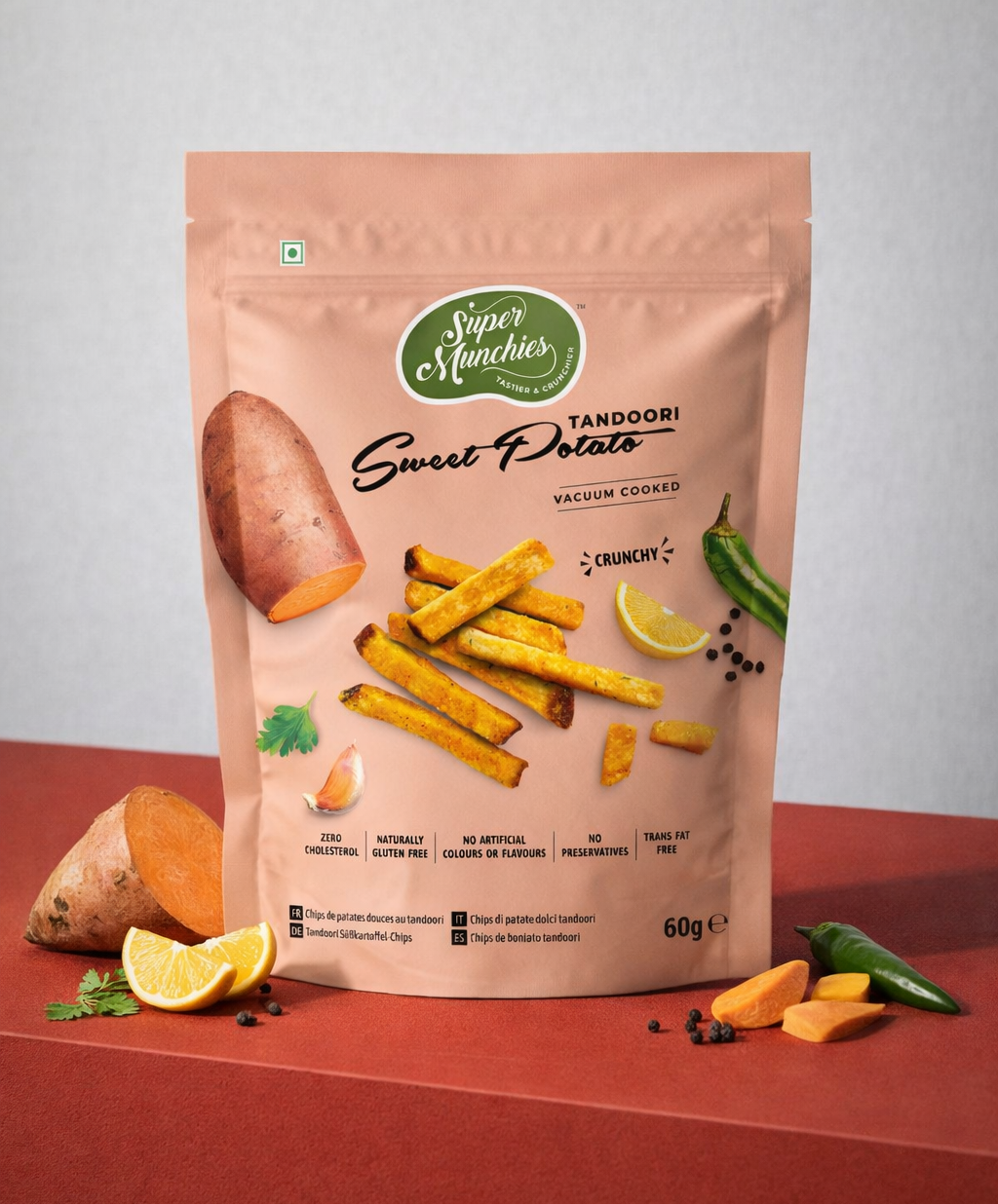 Super Munchies Tandoori Sweet Potato is made from real sweet potatoes that are sliced and gently vacuum cooked at low temperatures. The chips are seasoned with a warm tandoori spice blend that enhances the natural sweetness of the vegetable.