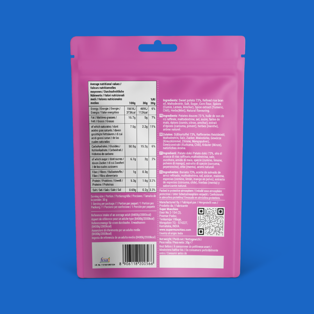 Poczuj idealną równowagę przypraw i świeżości z chipsami z batatów Super Munchies Chili Mint. Wykonane z prawdziwych batatów i doprawione pikantnym chili oraz orzeźwiającą miętą, każdy kęs to eksplozja smaku.