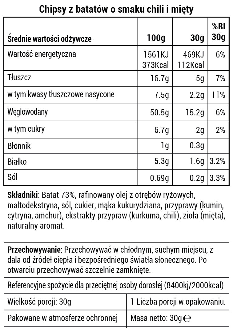 Prawdziwe chipsy z batatów z nutą ostrości i świeżości jednocześnie. Przyprawione odważnym akcentem chili i dodatkiem świeżej mięty, w połączeniu oferują idealną równowagę między pikantnością i orzeźwieniem. Każdy kęs jest chrupiący, wyrazisty i odrobinę zaskakujący.