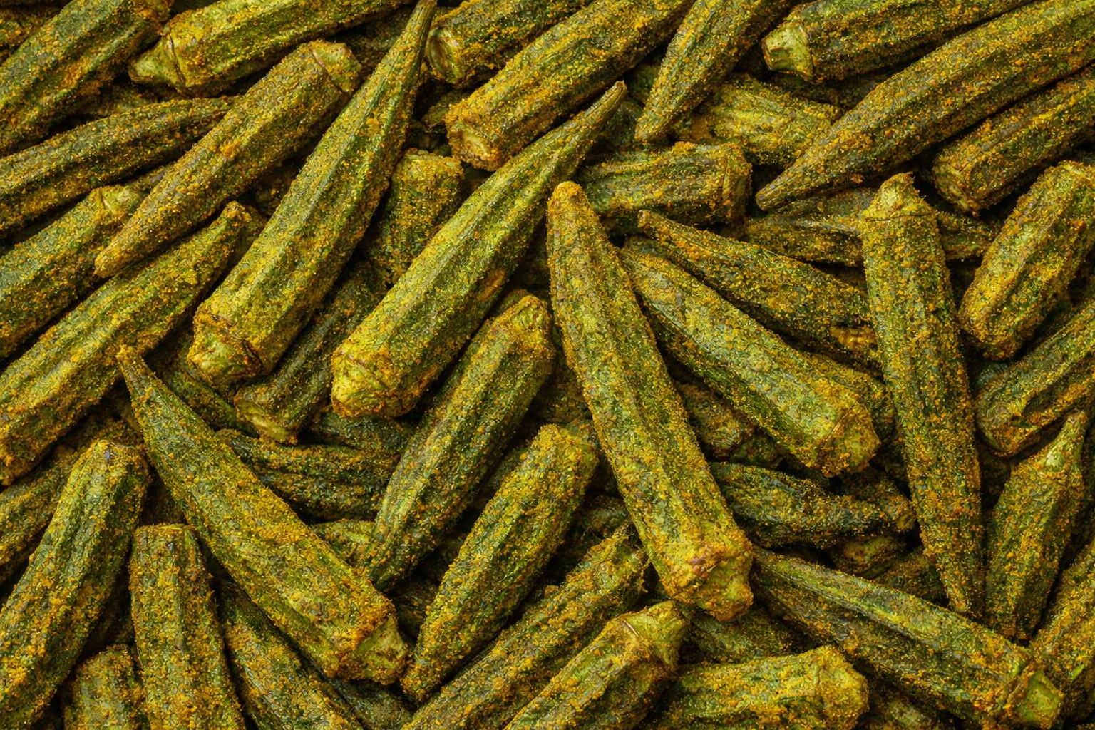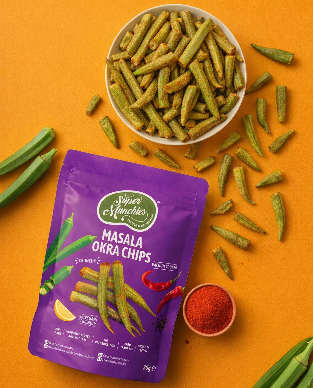 Okra Masala Super Munchies powstaje z prawdziwej okry, znanej również jako ladyfinger, która jest krojona i delikatnie przygotowywana metodą gotowania próżniowego w niskiej temperaturze. Następnie doprawiana jest zrównoważoną mieszanką przypraw masala, która podkreśla naturalny smak warzywa.