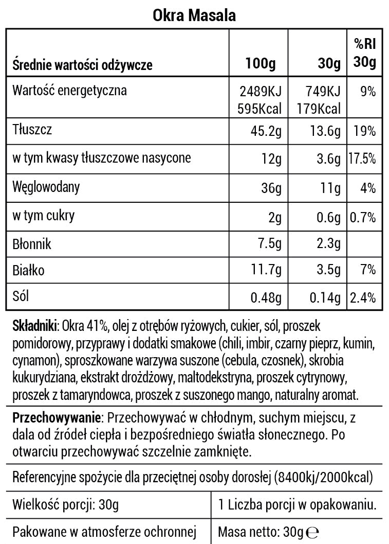 CHRUPIĄCE CHIPSY Z OKRY MASALA WYKONANE Z CAŁYCH STRĄKÓW OKRY, PRZYGOTOWANE TAK, ABY UZYSKAĆ LEKKĄ I CHRUPIĄCĄ STRUKTURĘ. TE WARZYWNE CHIPSY SĄ DOPRAWIONE AROMATYCZNĄ MIESZANKĄ INDYJSKICH PRZYPRAW MASALA, KTÓRA NADAJE IM WYRAZISTY, WYTRAWNY SMAK. NATURALNIE BOGATE W BŁONNIK I STANOWIĄCE ROŚLINNE ŹRÓDŁO BIAŁKA, DOSKONALE SPRAWDZAJĄ SIĘ JAKO PRZEKĄSKA DO LUNCHBOXA LUB CHRUPIĄCY DODATEK DO SAŁATEK.