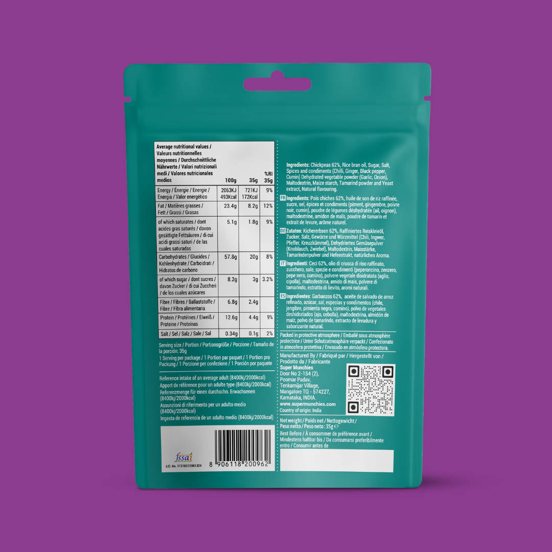 Chrupiąca prażona ciecierzyca w ostrej przyprawie Peri Peri. Ciecierzyca Super Munchies Peri Peri jest bogata w białko, pełna smaku i idealna na szybką, zdrową przekąskę w podróży.