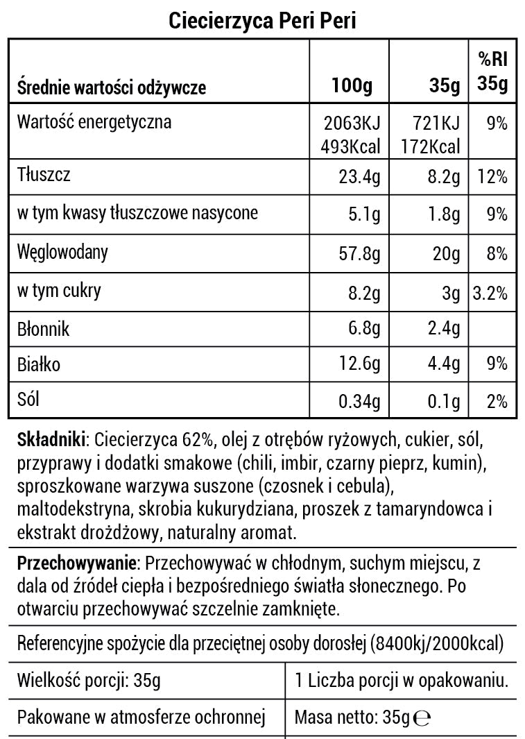 Ciecierzyca Super Munchies Peri Peri jest bogata w białko i błonnik, dzięki czemu idealnie nadaje się na szybką i zdrową przekąskę. Dodaj ją do sałatki, aby dodać jej chrupkości, lub zjedz ją prosto z opakowania. Doprawiona ostrą przyprawą peri-peri, zapewnia wyrazisty smak i długotrwałą energię w każdym kęsie.
