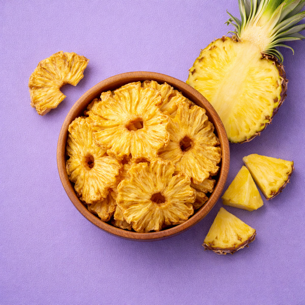 CHRUPIĄCE CHIPSY Z ANANASA WYKONANE Z PRAWDZIWYCH, DOJRZAŁYCH ANANASÓW, DELIKATNIE GOTOWANE PRÓŻNIOWO DLA LEKKIEJ CHRUPKOŚCI I SŁODKO-KWAŚNEGO SMAKU. NATURALNIE BOGATE W BŁONNIK, IDEALNE DO GRANOLI, LUNCHBOXÓW DLA DZIECI LUB JAKO ORZEŹWIAJĄCY KONTRAST DO ZIELONYCH SAŁATEK.