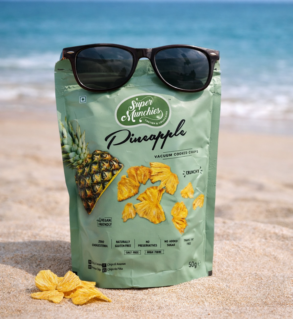 Chipsy z ananasa Super Munchies powstają z prawdziwych, dojrzałych ananasów. Owoce są delikatnie przygotowywane metodą gotowania próżniowego w niskiej temperaturze, aby zachować ich naturalną słodycz, wyrazisty smak i tropikalny aromat.